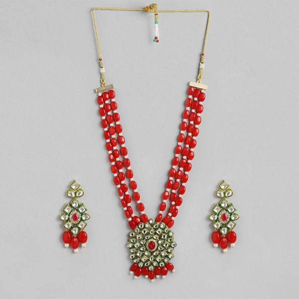 Red gold-plated necklace has beads & stone-studded details, secured with a drawstring closure